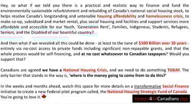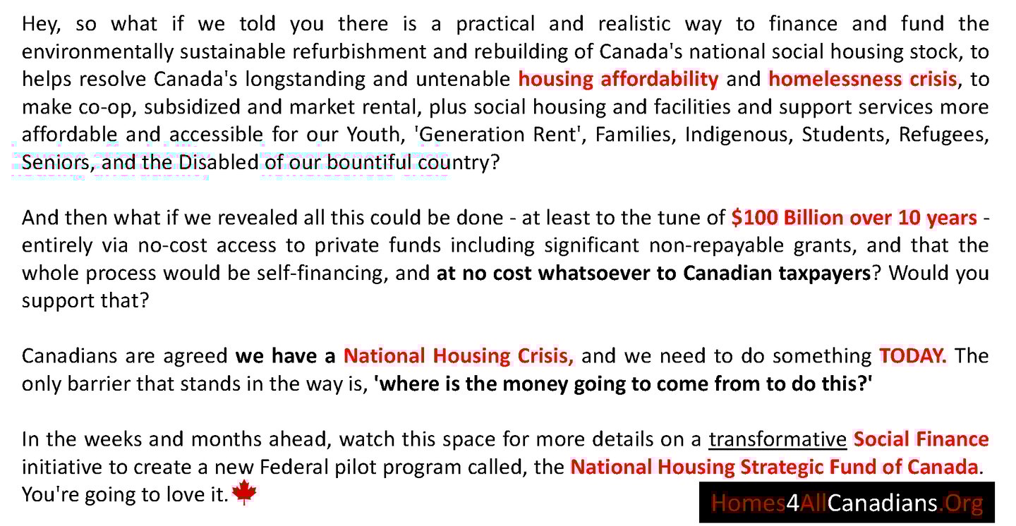 Homes4AllCanadians.org is a grassroots initiative aimed at addressing Canada's housing crisis through innovative financing solutions, mobilizing private capital for public good to ensure affordable housing for all without burdening Canada's taxpayers.